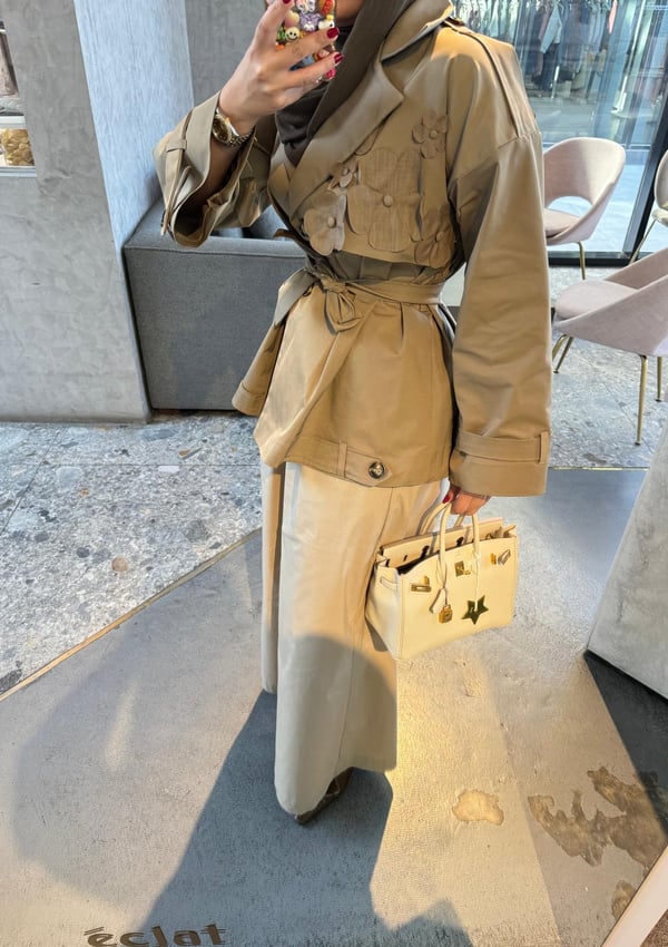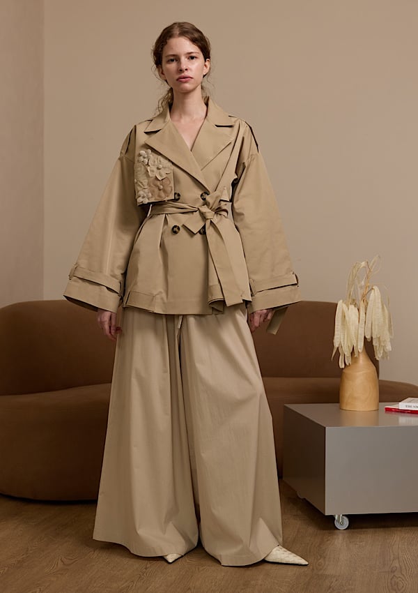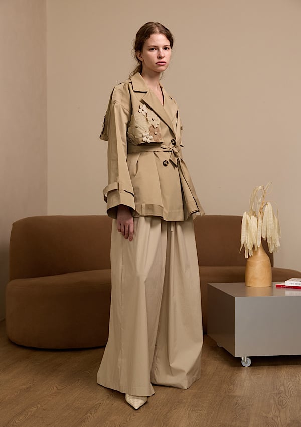 A very chic trench made coat with handmade flowers the perfect choice for summer & winter