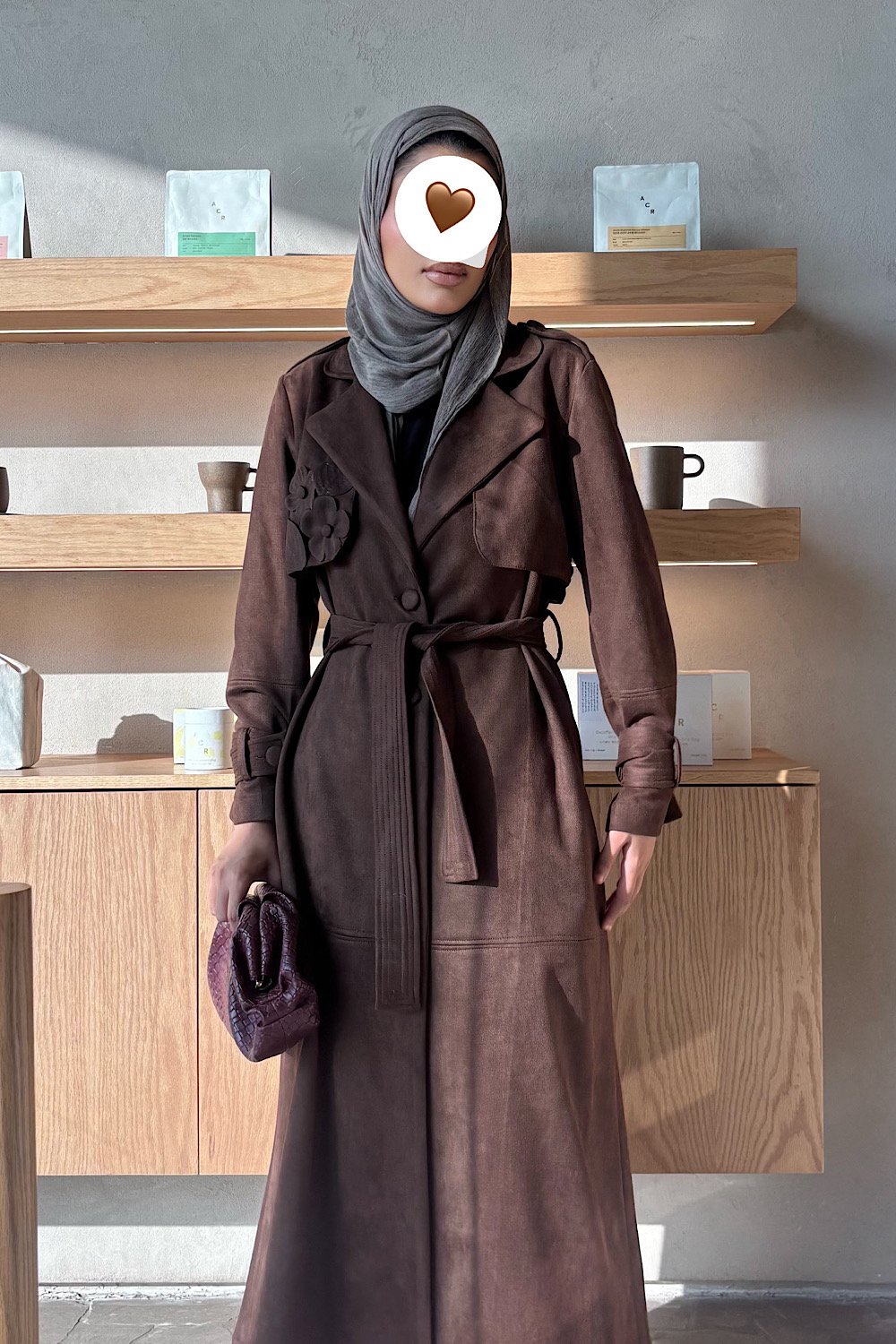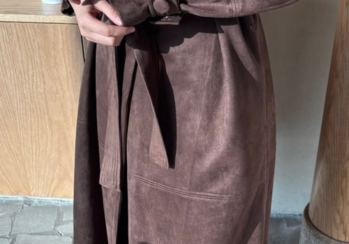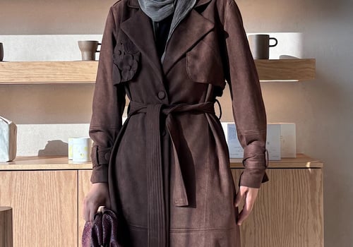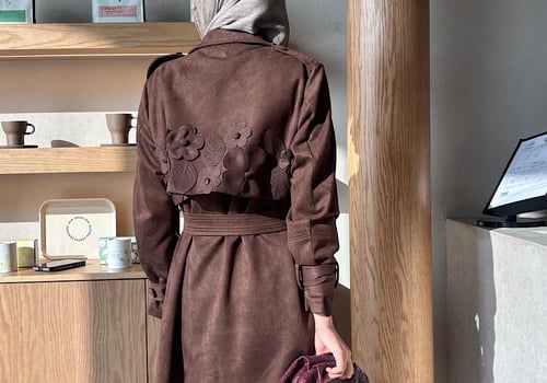 Suede brown trench coat with handmade flowers