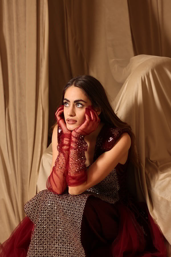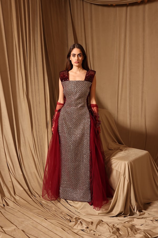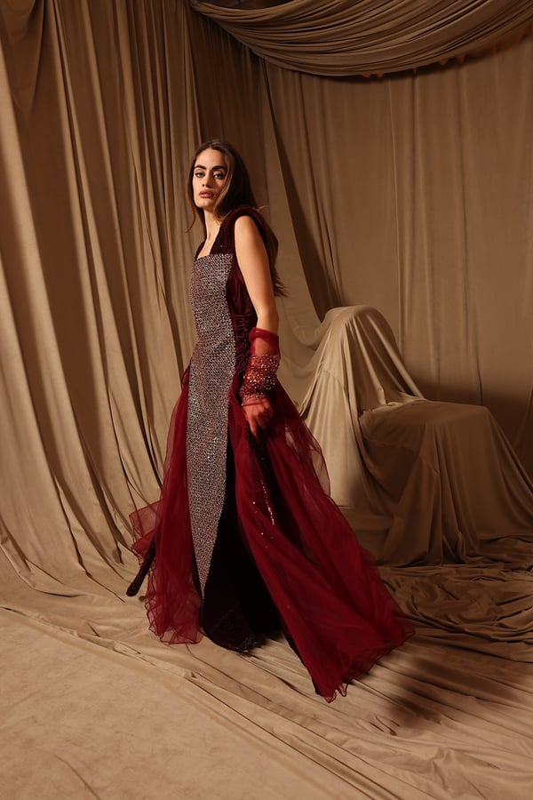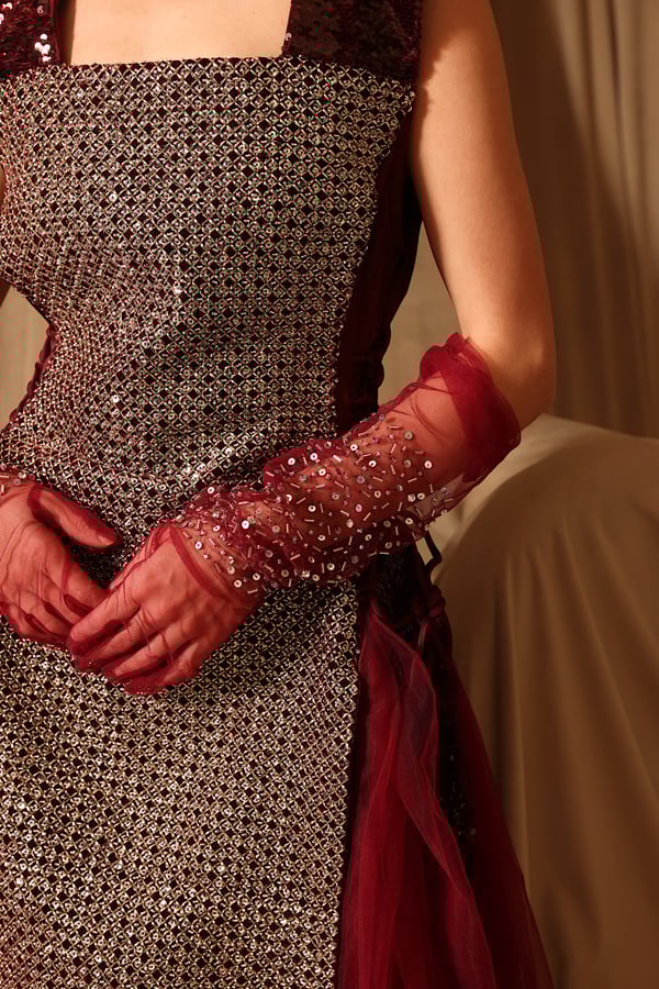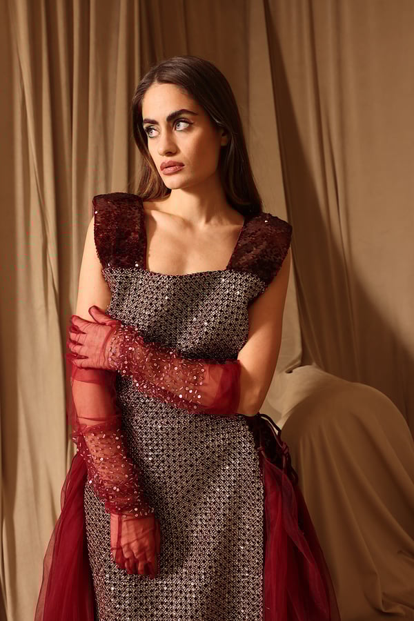 Burgundy chic kaftan with handmade gloves