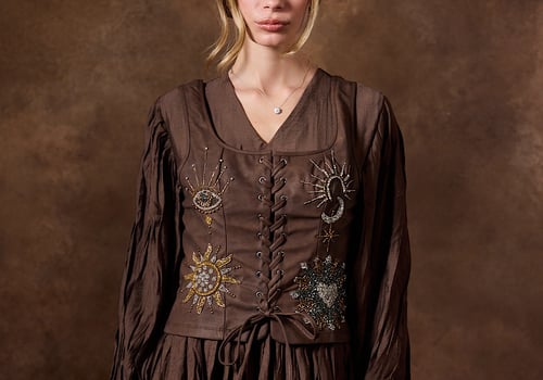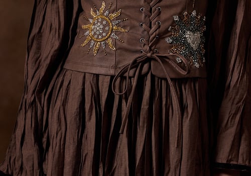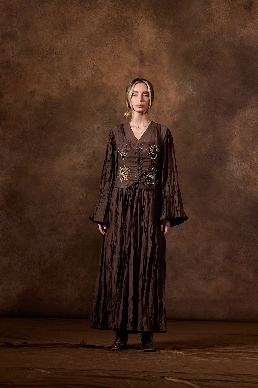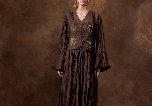 Handmade leather vest made with high quality crystals & pleated maxi dress .